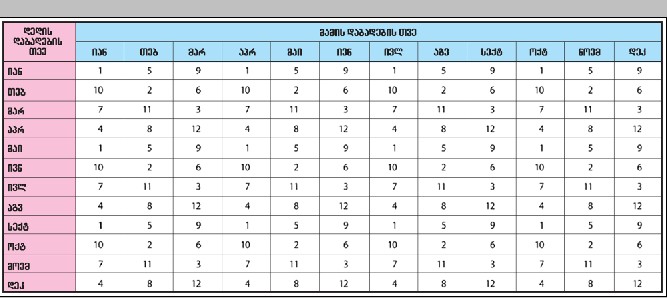 კალენდარში, ბავშვის ჩასახვის დროსთან ერთად, გათვალისწინებულია ორივე მშობლის დაბადების თვე. პირველ ცხრილში უნდა გაარკვიოთ თქვენი და თქვენი მეუღლის საერთო ციფრი: ის მდებარეობს ქალის დაბადების თვესა და მამაკაცის დაბადების თვის კვეთაზე.