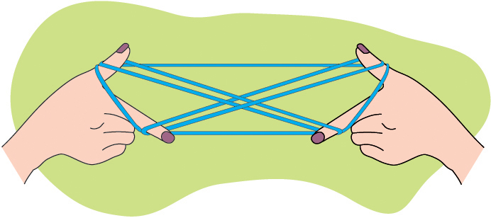 პირველი მოთამაშე: საჩვენებელი და დიდი თითით მოკიდე ძაფის გადაჯვარედინებულ ადგილებში და ძაფი გამოსდე ზედა ნაწილის პარალელურ ძაფებს. (სურ.10) მიღებულ ფიგურას მეორენაირი "გზაჯვარედინი" ჰქვია. (სურ.11)