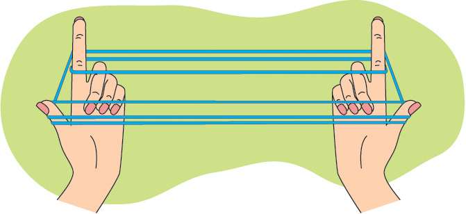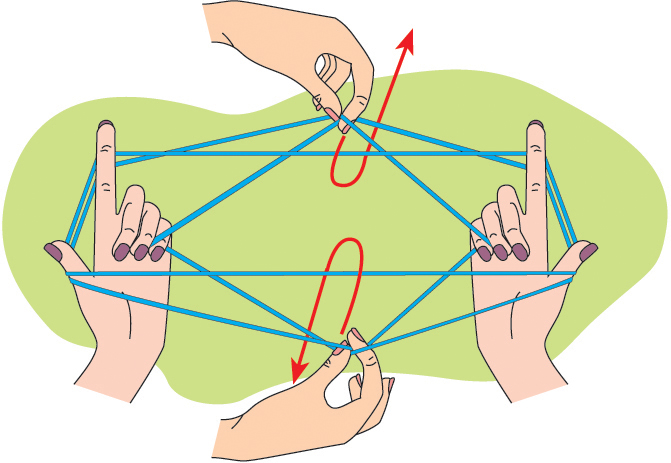 მეორე მოთამაშე: საჩვენებელი და დიდი თითებით ძაფის კუთხეებში მოკიდე და ქვემოდან ამოატარე. გაჭიმე ძაფი.