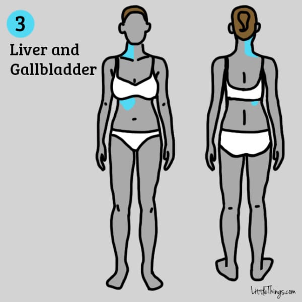 ღვიძლისა და ნაღვლის ბუშტისგან შესაძლოა, აგტკივდეთ კისერი და მხრების ზონა, ასევე, მუცლის მარჯვენა მხარე, მკერდიდან ოდნავ დაბლა.
