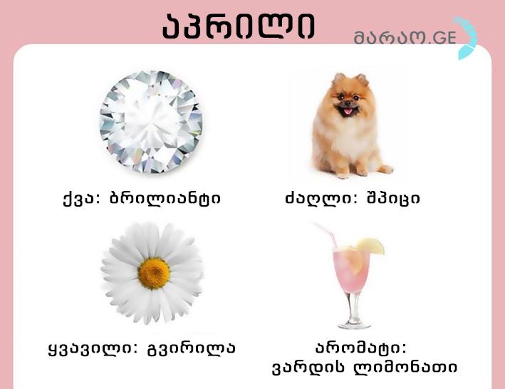 აპრილში დაბადებულები გამორჩეული, ოქროს გულის მქონე ადამიანები არიან. ისინი გიჟდებიან ახლობლებისთვის საჩუქრებისა და სიურპრიზების კეთებაზე. არაფერი ისე არ აბედნიერებთ, როგორც საყვარელი ადამიანების თვალებში სიხარულის ნაპერწკლის დანახვა. ისინი თავიანთი სითბოთი ნებისმიერ სივრცეს გაათბობენ. ყოველთვის ტოვებენ შთაბეჭდილებას საზოგადოებაში. მათ ყოველთვის შეგიძლიათ დაეყრდნოთ.