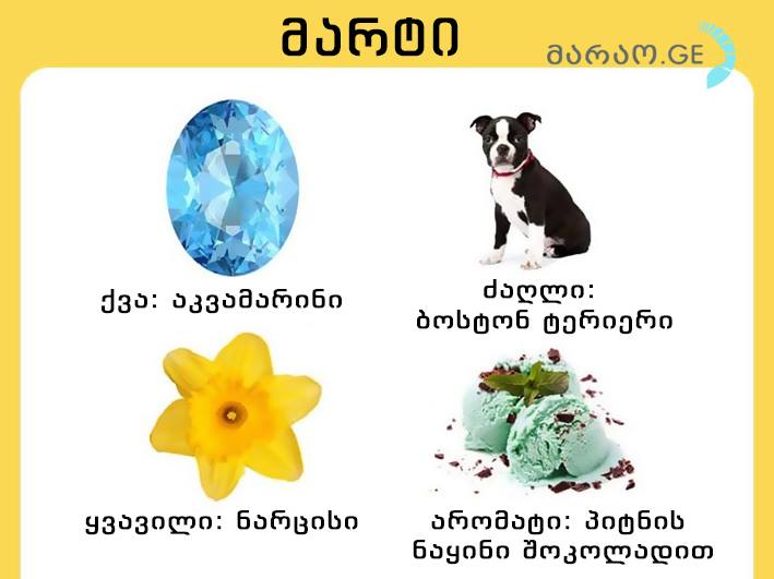 მარტში დაბადებულები შემოქმედებითი და საინტერესო ადამიანები არიან. ისინი კაშკაშა და ენერგიული ცხოვრებით ცხოვრობენ, მოსწონთ ყოველდღე რაიმე ახლის შეცნობა, ახალი კერძების გასინჯვა, ახალი ადგილების მონახულება. ისინი გულის კარნახს უფრო ენდობიან, ვიდრე გონების და ყოველთვის იმას ამბობენ, რასაც ფიქრობენ. ცდილობენ, დაიცვან პირადი სივრცე, მაგრამ როცა სულით მონათესავე ადამიანს ხვდებიან, ისინი მართლაც ყვავილივით იფურჩქნებიან.