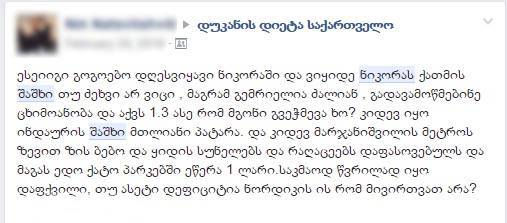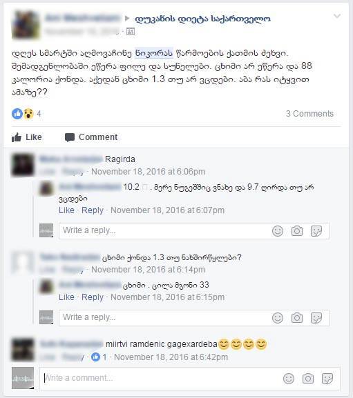 მშობიარობის შემდეგ ფსიქოლოგიურად ძალიან გამიჭირდა. წონაში ისედაც მომატებულმა ყოველ ღამით გვიან ჭამა დავიწყე. იმის მაგივრად, რომ ფორმის დაბრუნებაზე მეზრუნა, უფრო და უფრო ვიმატებდი. ჩემი მეგობარი ყოველდღე სხვადასხვა დიეტას მიგზავნიდა და ყველანაირად მამხნევებდა, რომ დიეტა დამეწყო. მე კი ნებისყოფა არ მყოფნიდა. ერთ დღეს კი მისგან საოცარი ”სქრინი” მივიღე. წონით ჩემსავით შეწუხებული ერთ-ერთი გოგონა ”დუკანის დიეტა საქართველოს” ჯგუფში კითხულობდა, მართლა შეიძლებოდა თუ არა ამ დიეტის დროს ”ნიკორას” პროდუქციის მირთმევა.