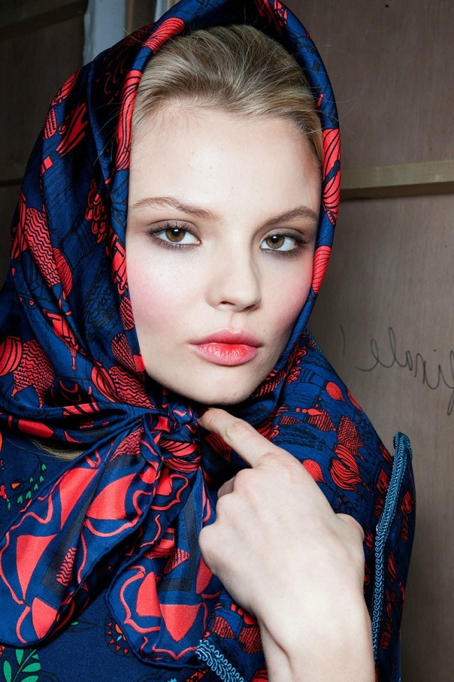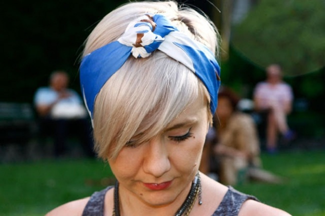 თხემთან გაკვანძული თავშალი ძალიან რომანტიკულად გამოიყურება.