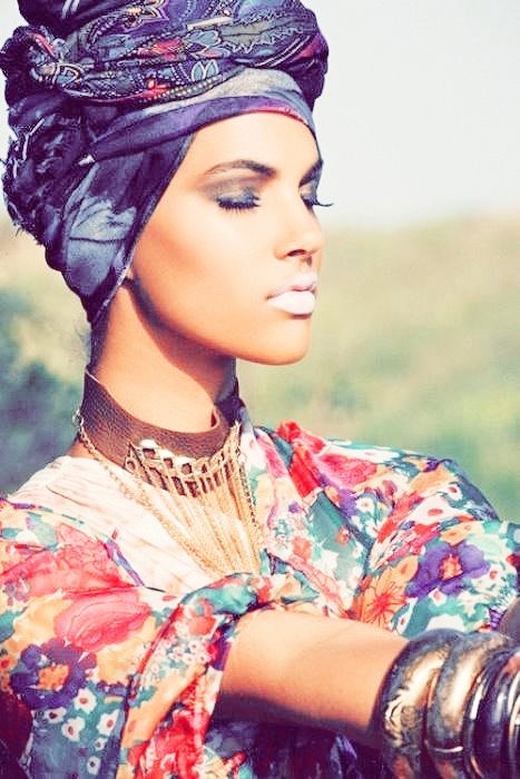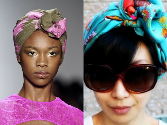 აფრიკულ სტილში გაკეთებული კაშკაშა ფერის თავშლები და ატლასის შარფები – მართლაც შესანიშნავი იდეაა. გაიკეთე მაღალი კუდი, შემდეგ კი თავზე გაიკეთე თავშალი. შეკარი ბოლოები წინიდან ისე, რომ დამალო თავშლის წვერები.
