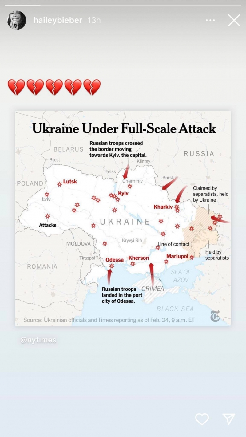 ჰეილი ბიბერმა უკრაინისადმი თანადგომის დასაფიქსირებლად უკრაინის რუკა გააზიარა, რომელზეც რუსული თვითმფრინავების მდებარეობებია ასახული.