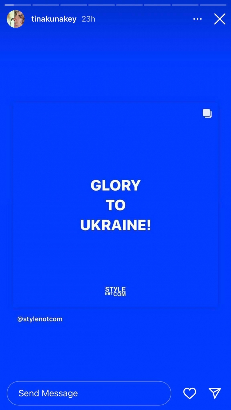 ტინა კუნაკიმ უკრაინას სოლიდარობა "ინსტაგრამ სთორის" საშუალებით გამოუცხადა. ,,დიდება უკრაინას’’ - დაწერა მოდელმა.