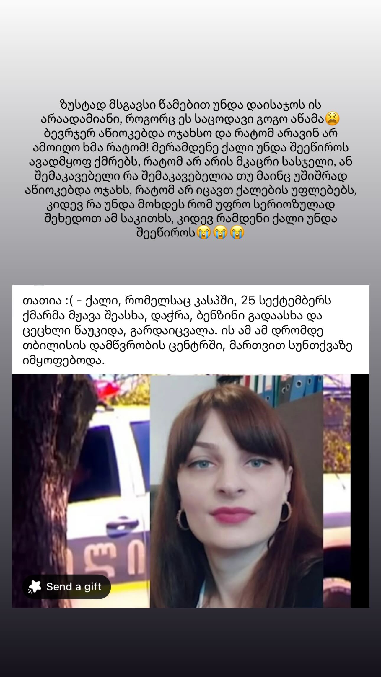 "ზუსტად მსგავსი წამებით უნდა დაისაჯოს ის არაადამიანი, როგორც ეს საცოდავი გოგო დატანჯა. ხშირად აწიოკებდა ოჯახსო და რატომ არავინ არ ამოიღო ხმა, რატომ! მერამდენე ქალი უნდა შეეწიროს ავადმყოფ ქმარს, რატომ არ არის მკაცრი სასჯელი, ან შემაკავებელი. რა შემაკავებელია, თუ მაინც უშიშრად აწიოკებდა ოჯახს, რატომ არ იცავთ ქალების უფლებებს, კიდევ რა უნდა მოხდეს, რომ უფრო სერიოზულად შეხედოთ ამ საკითხს, კიდევ რამდენი ქალი უნდა შეეწიროს" - ასე ეხმიანება თაკო საზინა კასპში მომხდარ სასტიკ მკვლელობას.
