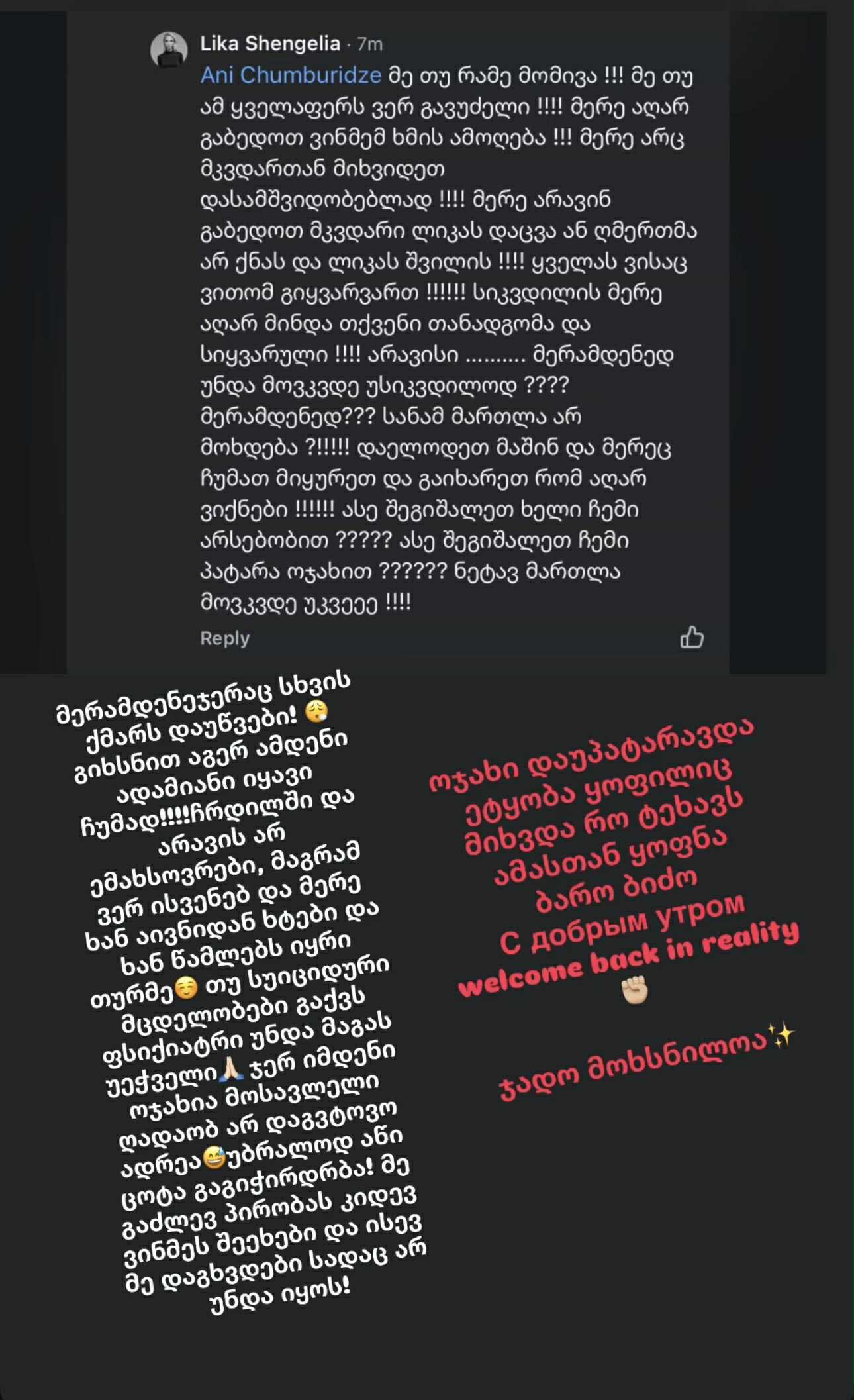 "მე თუ რამე მომივა! მე თუ ამ ყველაფერს ვერ გავუძელი! მერე აღარ გაბედოთ ვინმემ ხმის ამოღებას, მერამდენედ უნდა მოვკვდე უსიკვდილოდ," - წერს ლიკა.