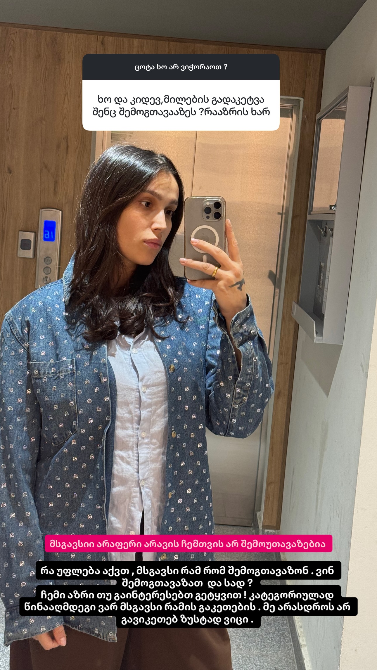 "სამწუხაროდ, ყველაფერს ვჭამ, ჯერ-ჯერობით ისევ ვერ გამოვედი მშობიარობის შემდგომი დეპრესიიდან. ამიტომ არ მაქვს იმის თავი, რომ 18-საათიანი დიეტა დავიწყო, როცა შევძლებ, აუცილებლად დავიწყებ.