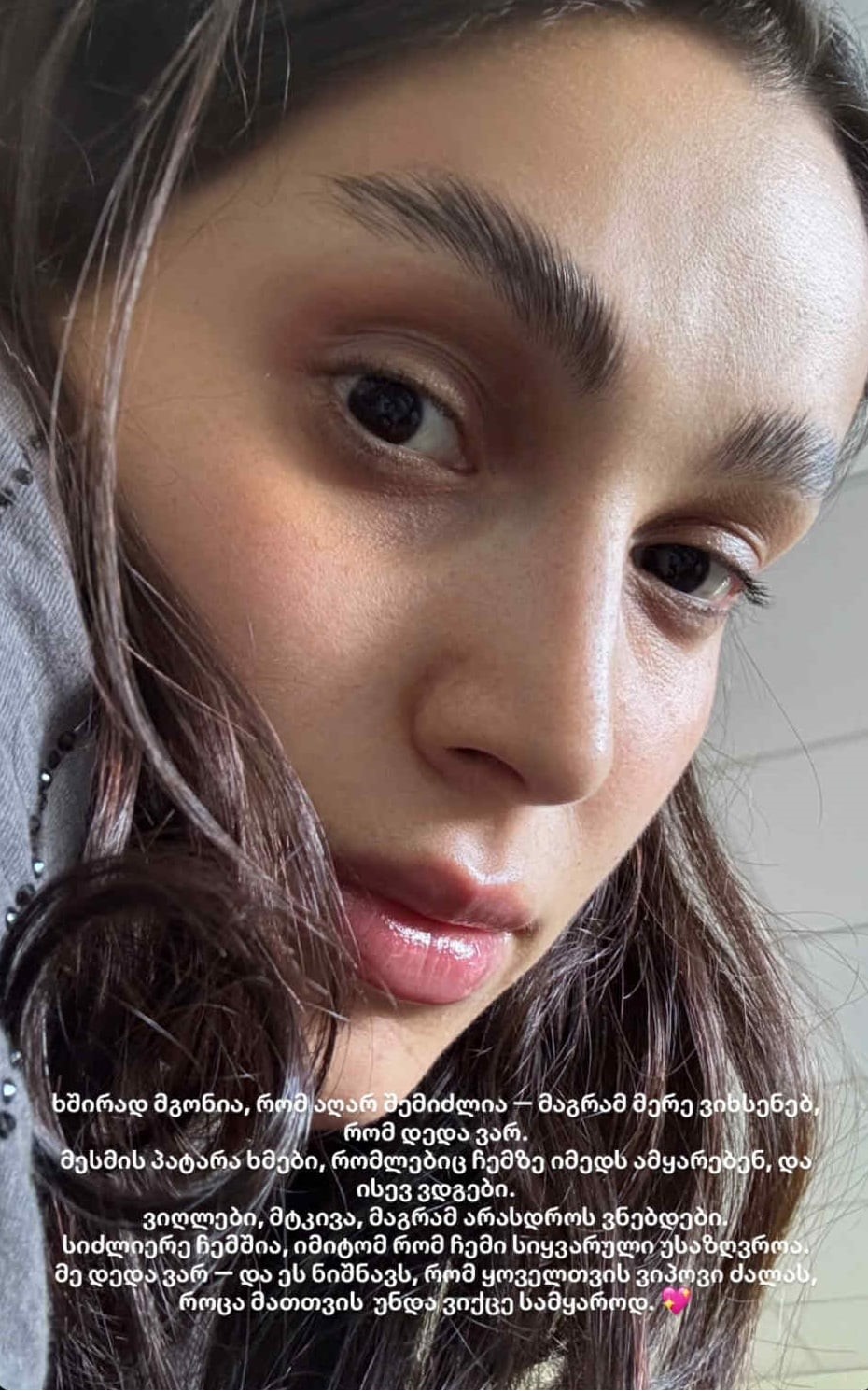 "ხშირად მგონია, რომ არ შემიძლია - მაგრამ მერე ვიხსენებ, რომ დედა ვარ. მესმის პატარა ხმები, რომლებიც ჩემზე იმედს ამყარებენ და ისევ ვდგები. ვიღლები, მტკივა, მაგრამ არასდროს ვნებდები. სიძლიერე ჩემშია, იმიტომ, რომ ჩემი სიყვარული უსაზღვროა. მე დედა ვარ - და ეს ნიშნავს, რომ ყოველთვის ვიპოვი ძალას, როცა მათთვის უნდა ვიქცე სამყაროდ," - წერს ნინო გველესიანი.