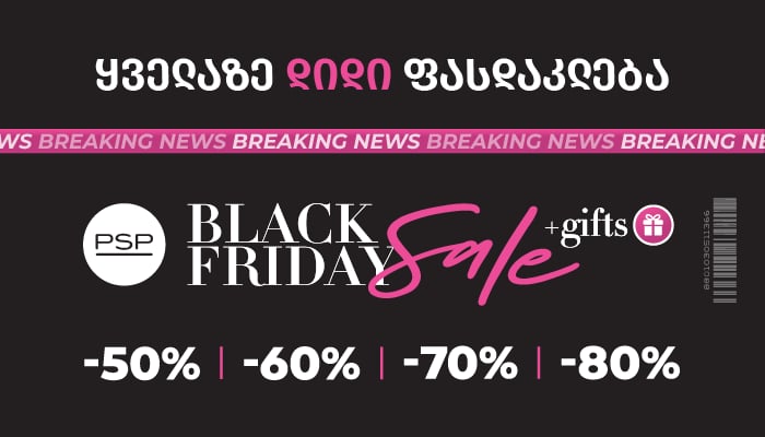 PSP-ს Black Friday-ს კვირეული საუკეთესო შესაძლებლობაა, ყველაზე ხელმისაწვდომ ფასად განვაახლოთ ჩვენი თავის მოვლის რუტინა. წელს, PSP-ში დაგხვდებათ ყველაზე დიდი - 50, 60, 70 და 80%-იანი ფასდაკლებები, რომელიც თითქმის სრულ ასორტიმენტზე ვრცელდება.