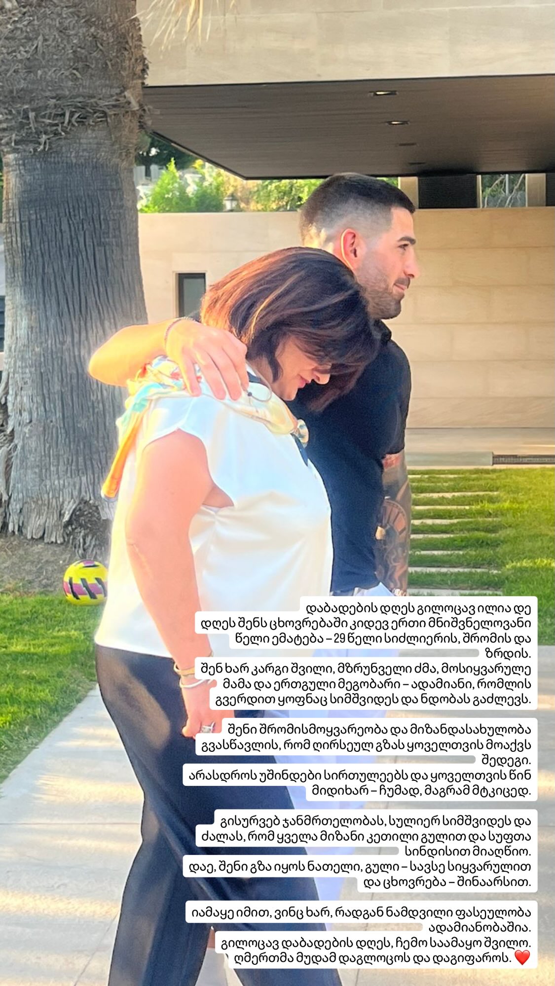 „დაბადების დღეს გილოცავ, ილია, დე. დღეს შენს ცხოვრებას კიდევ ერთი მნიშვნელოვანი წელი ემატება – 29 წელი სიძლიერის, შრომის და ზრდის.