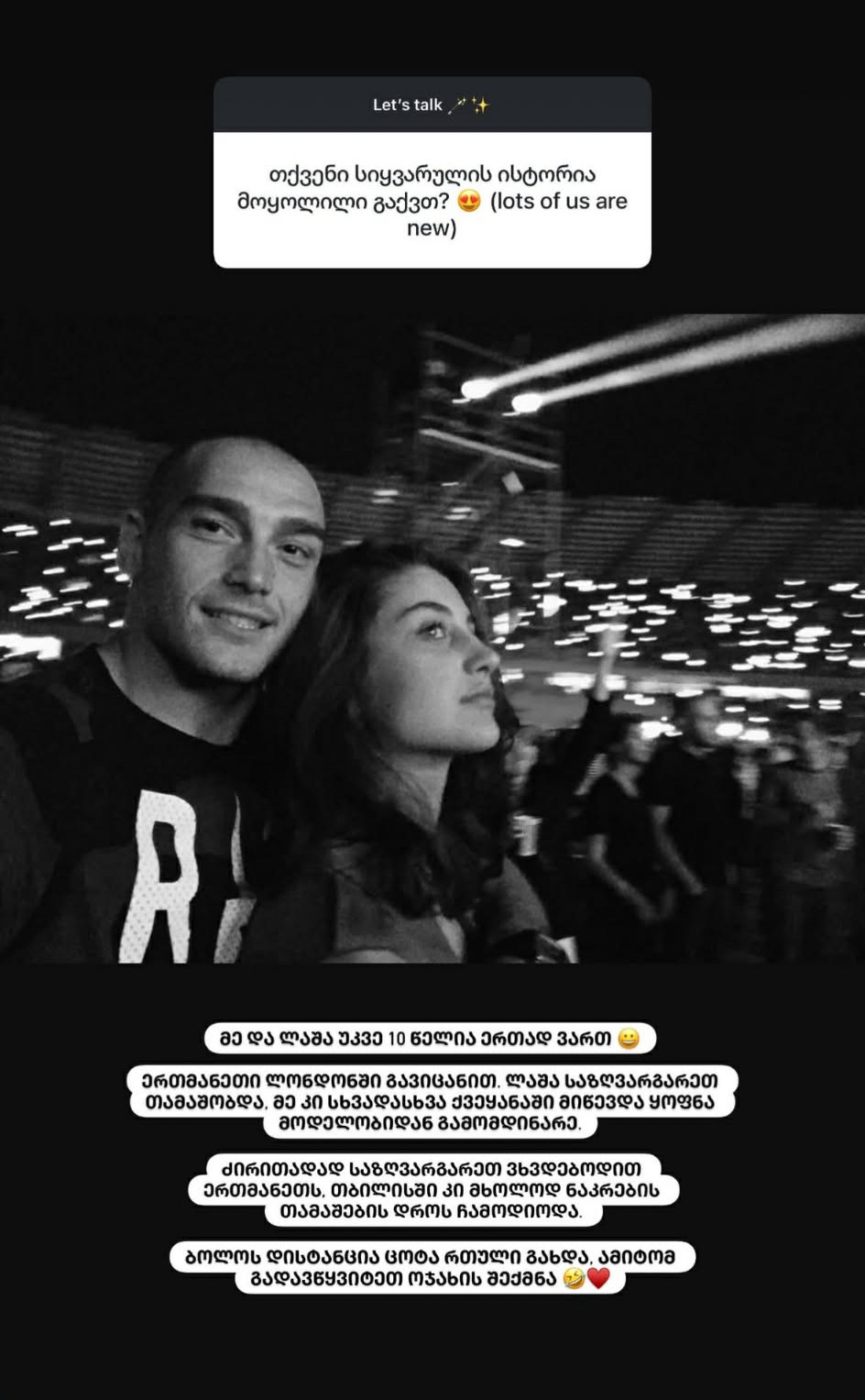 ძირითადად, საზღვარგარეთ ვხვდებოდით ერთმანეთს, თბილისში კი მხოლოდ საქართველოს ნაკრების თამაშების დროს ჩამოდიოდა. ბოლოს დისტანცია ცოტა რთული გახდა, ამიტომ გადავწყვიტეთ ოჯახის შექმნა", - წერს ანა შელია.