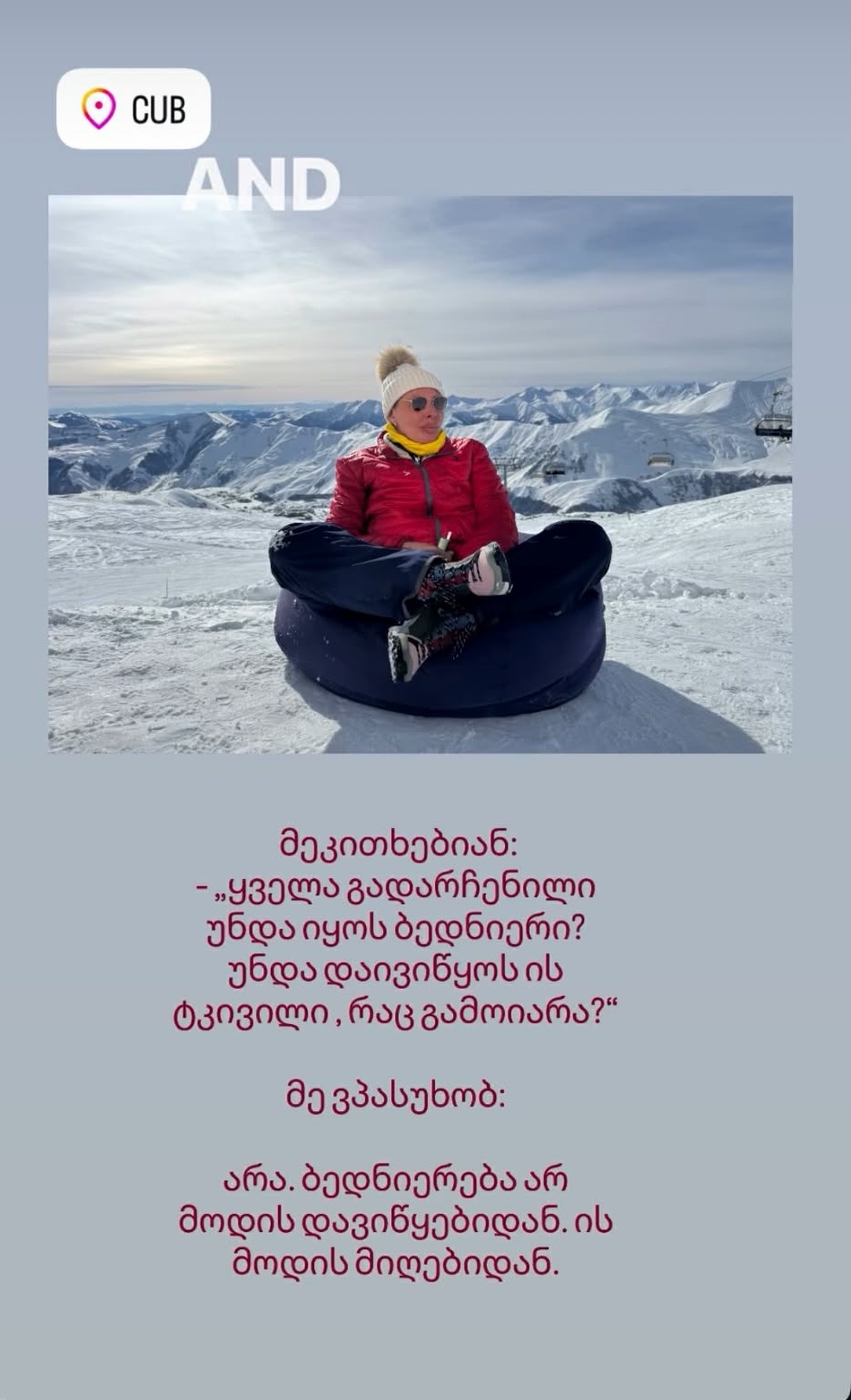 მე მივხვდი, რატომ დავიწყე მთაში სიარული, ეს იყო ჩემი გლოვის რიტუალი, მარტო ვრჩებოდი საკუთარ თავთან. მეშინია, როგორ აისახება ეს ექვსი თვე ჩემი დარჩენილი ცხოვრების ხარისხზე.
