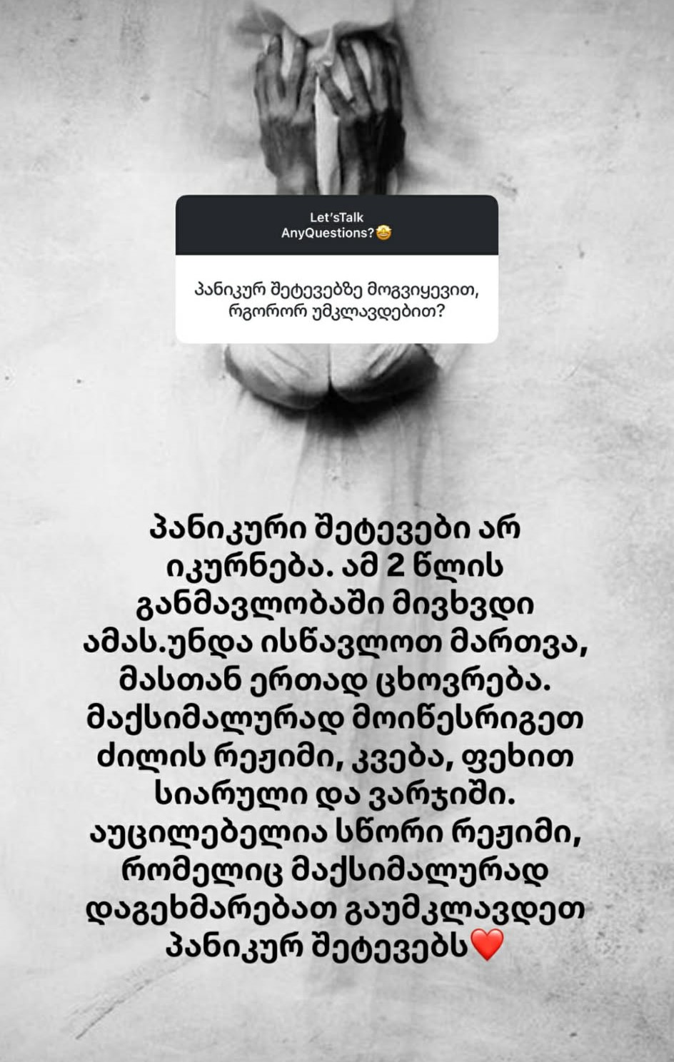 "პანიკური შეტევა არ იკურნება. ამ ორი წლის განმავლობაში მივხვდი ამას. უნდა ისწავლოთ მართვა, მასთან ერთად ცხოვრება. მაქსიმალურად მოიწესრიგეთ ძილის რეჟიმი, კვება, ფეხით სიარული და ვარჯიში. აუცილებელია სწორი რეჟიმი, რომელიც მაქსიმალურად დაგეხმარებათ, გაუმკლავდეთ პანიკურ შეტევებს" - წერს ნინი.