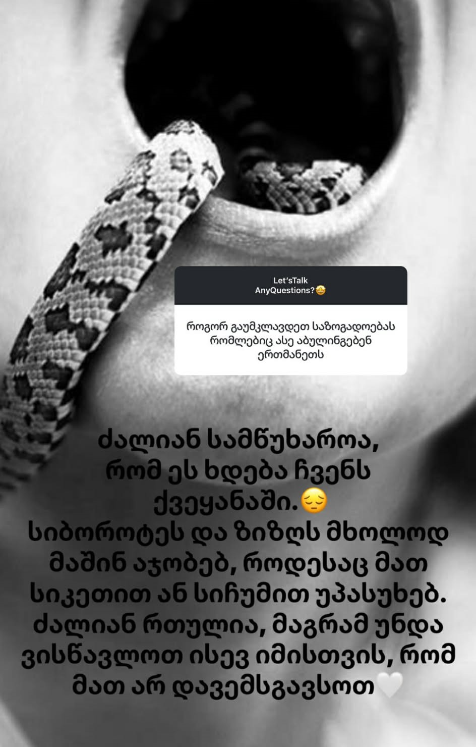 ერთ-ერთ პასუხში ნინიმ საზოგადოებაში არსებულ ნეგატიურ გარემოზეც გაამახვილა ყურადღება.