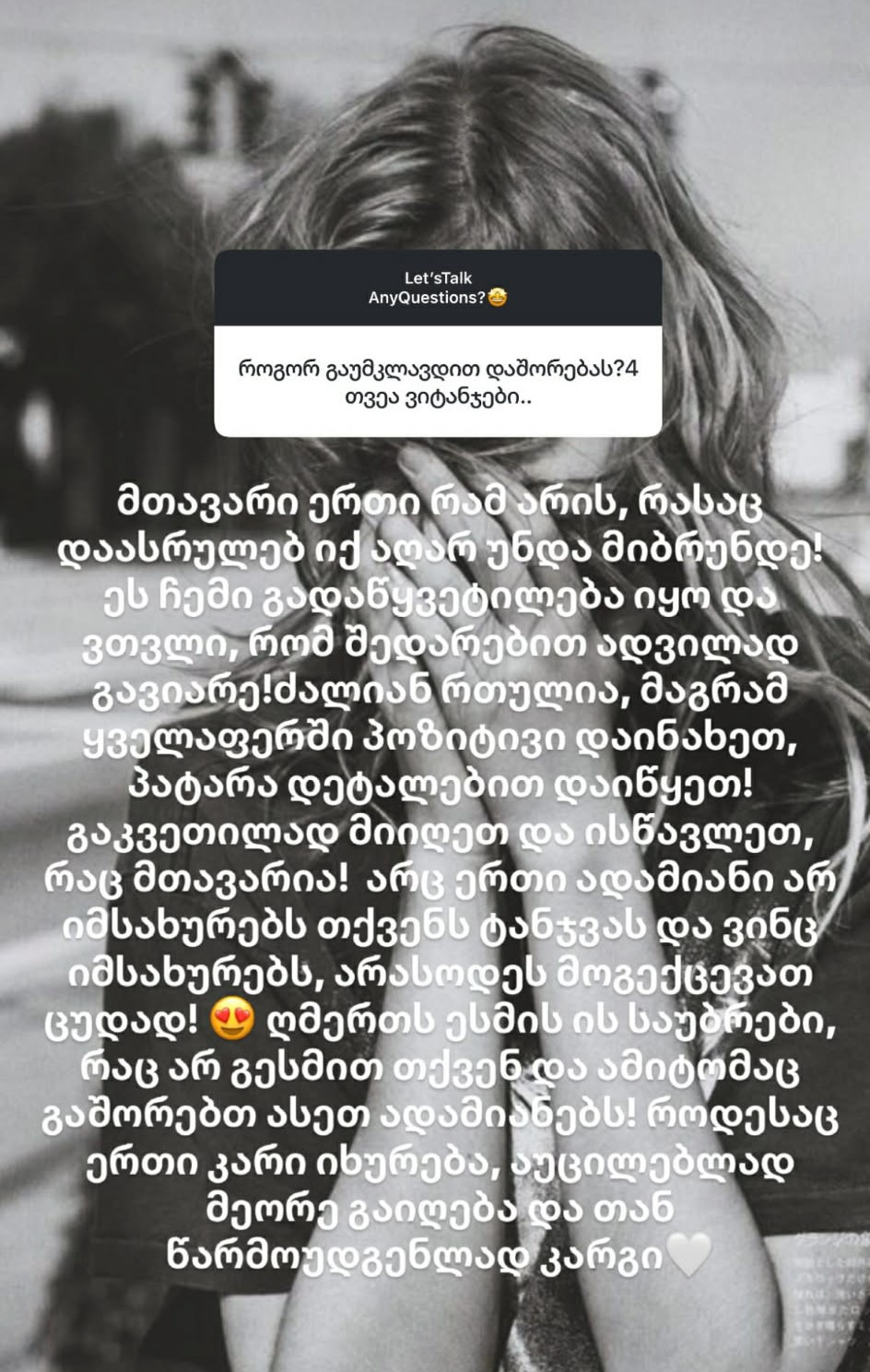 "მთავარი ერთი რამ არის, რასაც დაასრულებ, იქ აღარ უნდა მიბრუნდე! ეს ჩემი გადაწყვეტილება იყო და ვთვლი, რომ შედარებით ადვილად გავიარე! ძალიან რთულია, მაგრამ ყველაფერში პოზიტივი დაინახეთ, პატარა დეტალებით დაიწყეთ! გაკვეთილად მიიღეთ და ისწავლეთ, რაც მთავარია! არც ერთი ადამიანი არ იმსახურებს თქვენს ტანჯვას და ვინც იმსახურებს, არასოდეს მოგექცევათ ცუდად! ღმერთს ესმის ის საუბარი, რაც არ გესმით თქვენ, ამიტომ გაშორებთ ასეთ ადამიანებს! როდესაც ერთი კარი იხურება, აუცილებლად მეორე გაიღება და თან წარმოუდგენლად კარგი".