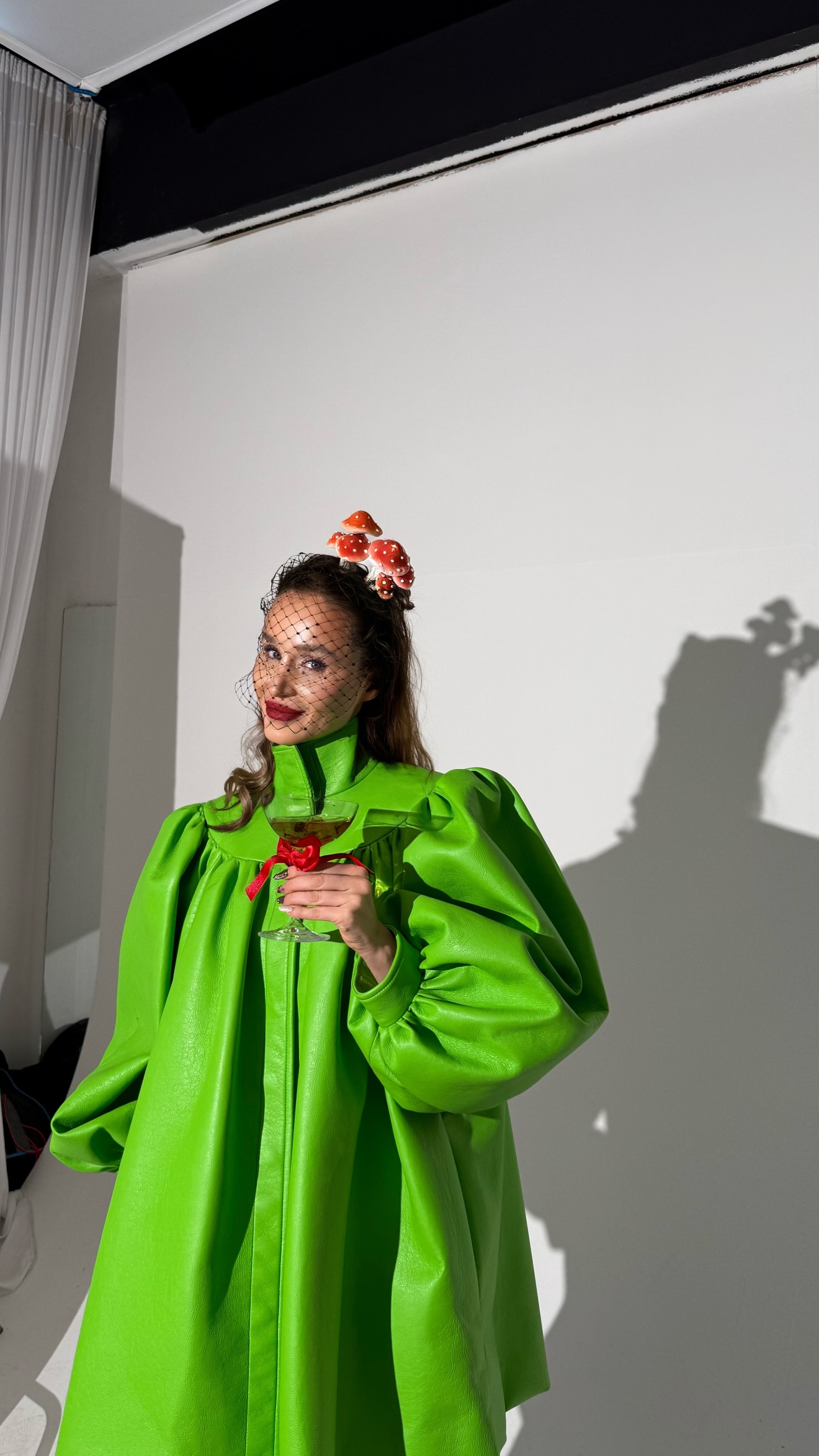 ფოტოზე ანუკი ძალიან საინტერესო და განსხვავებულ სტილშია წარმოდგენილი. მას კაშკაშა მწვანე, თავისუფალი სტილის მოსასხამი აცვია. თუმცა, ყველაზე მეტად ყურადღებას მისი თავსაბურავი იქცევს, წითელი სოკოები და შავი ბადე, რაც მის იერსახეს განსხვავებულ ელფერს სძენს.