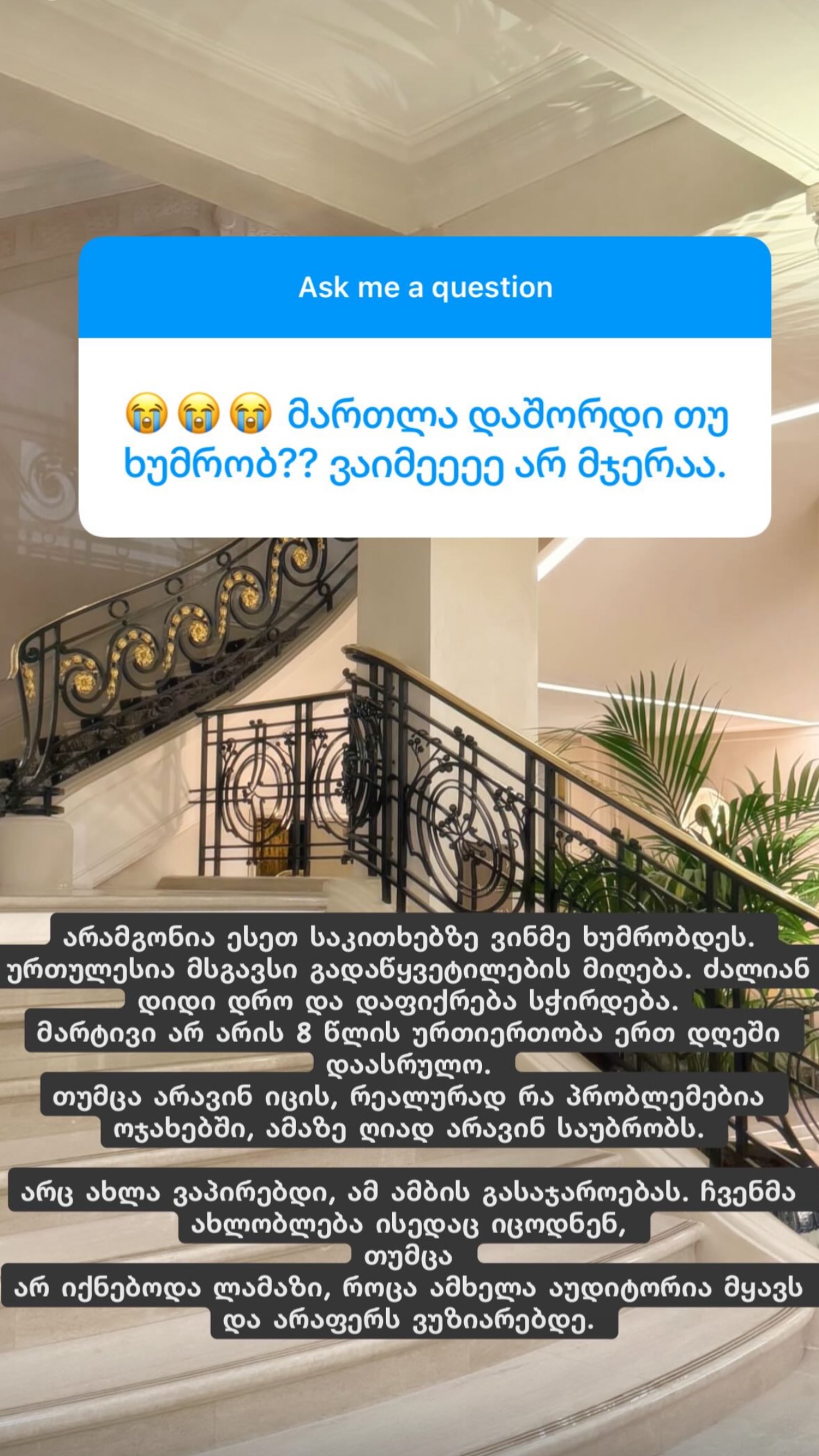 არ მგონია, ასეთ საკითხზე ვინმე ხუმრობდეს. ურთულესია მსგავსი გადაწყვეტილების მიღება. ძალიან დიდი დრო და დაფიქრება სჭირდება. მარტივი არ არის 8 წლიანი ურთიერთობა ერთ დღეში დაასრულო. თუმცა არავინ იცის, რეალურად რა პრობლემებია ოჯახებში, ამაზე ღიად არავინ საუბრობს. არც ახლა ვაპირებდი გასაჯაროებას. ჩვენმა ახლობლებმა ისედაც იცოდნენ, თუმცა არ იქნებოდა ლამაზი, როცა ამხელა აუდიტორია მყავს, არაფერს ვუზიარებდე," - წერს მარიამი.