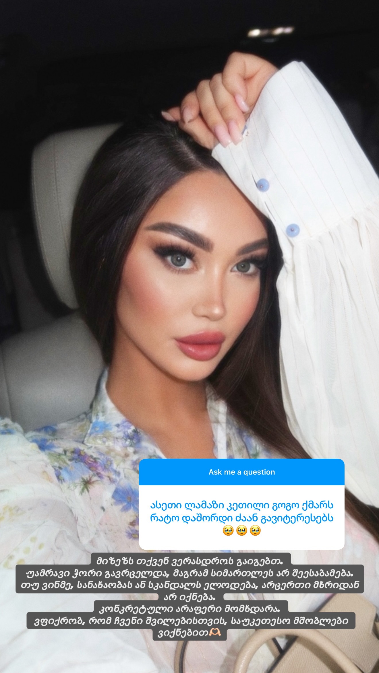 "სანამ ჩემს მეუღლეს გავიცნობდი, მე უკვე „ინფლუენსერი“ ვიყავი. იმ დროს ამ საქმიანობის შესახებ ბევრმა საერთოდ არ იცოდა. ვიღებდი ფოტოებს, ლამაზად ვიცვამდი, რეკლამებს ვაკეთებდი და ასე დავიწყე თანხის გამომუშავება. ვერ ვიტყვი, რომ ფინანსურად მხოლოდ მეუღლეზე ვარ დამოკიდებული. თვითონაც მაქვს შემოსავალი. მეუღლეს თავისი ბიზნესები აქვს, კაპიტანია და სამი თვით მიდის ხოლმე, მაგრამ ის ჩემი მთავარი საყრდენია და ყველაფერში გვერდით მიდგას.