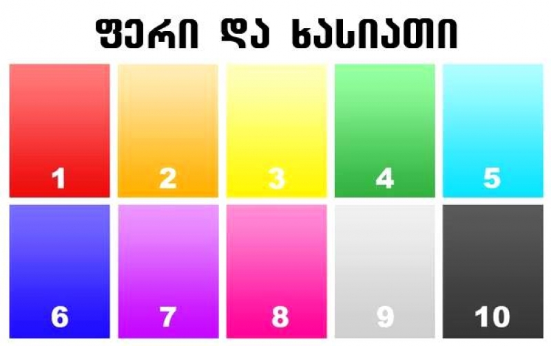 ამოიცანით თქვენი ხასიათის ძლიერი და სუსტი მხარე. ამისათვის ორი ფერი უნდა აირჩიოთ -ერთი, რომელიც გიყვართ და მეორე, რომელიც არ გსიამოვნებთ. ფერი, რომელიც გიყვართ, ეს თქვენი დადებითი მხარეა; ფერი, რომელიც არ გსიამოვნებთ -თქვენი მეორე, უარყოფითი მხარე.